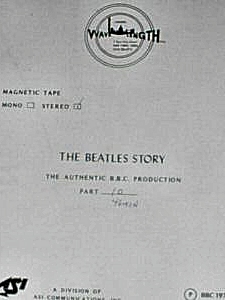 The is the first extensive BBC Radio documentary on The Beatles and was assembled in the winter of 1971-1972. Produced by Johnny Beerling and hosted by BRian Matthew it was aired on BBC Radio One on Sunday nights at 5pm from May through August 1972. Later in 1972, the series was sold to the U.S. for syndication.The U.S. version trimmed each episode to make room for commercials. The original BBC broadcasts were 55 minutes but, as described by the auction below, these reels are 46 minutes long. So this must be the U.S. version. For details of the contents of these reels, see John C. Winn's book, Lifting Latches. See a 1973 14 reel updated and expanded version of the series - here. AUCTION DESCRIPTION: BEATLES STORY SET OF 13 TAPES ONE OF THE MOST UNUSUAL AND UNIQUE ITEMS ON EBAY Item location: Nottinghamshire, United Kingdom THIS MUST BE ONE OF THE MOST UNUSUAL AND UNIQUE ITEMS TO COME UP FOR SALE ON E-BAY. THE BEATLES STORY IS A 13 ORIGINAL 10" REEL TO REEL TAPE SET. THIS WAS RECORDED FOR BROADCAST ON THE BBC IN THE EARLY 70s. THESE TAPES WERE SENT OUT FOR THE USE OF OTHER RADIO STATIONS. THIS SET COMES FROM LONDON WAVELENGTH INC. 51st NEW YORK. ALL TAPES HAVE ONE WEEKS BROADCAST AND ARE APPROXIMATELY 46 MINUTES LONG AND ALL COME IN STEREO.THE WRITING ON THE FRONT OF THE BOX SAYS FROM TOP TO BOTTOM, LONDON WAVELENGTH LOGO, METALLIC TAPE, MONO STEREO, THE BEATLES STORY, THE AUTHENTIC B.B.C. PRODUCTION, PART # AND TIME HAND-WRITTEN ON, A S I LOGO, A DIVISION OF A S I COMMUNICATIOS INC. (P) BBC 1972. ALL TAPES ARE IN EXCELLENT CONDITION. NUMBERS 1 AND 2 COME IN WHITE BOXES AND TAPE IS ON METAL SPOOLS, ALL THE REST ARE IN BROWN BOXES AND ARE ON PLASTIC SPOOLS. THIS IS A PIECE OF BEATLES HISTORY IN THE MAKING!!! HEAR THE BEATLES' STORY TOLD BY BRIAN MATTHEWS, FULL OF INTERVIEWS WITH ALL FOUR OF THE LADS, HEAR WHAT THE BEATLES HAVE TO SAY ABOUT THE SPLIT-UP, AND HOW PAUL McCARTNEY SOUNDED BEFORE HE JOINED THE GROUP, AND MUCH , MUCH MORE. A FANTASTIC ADDITION TO ANY BEATLES COLLECTION. ![]() ![]() |