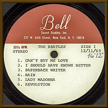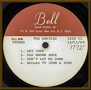 AUCTION DESCRIPTION: 1969. “Hey Jude”, also known as “The Beatles Again”, was a Capitol Records prepared compilation LP of singles which was released in February 1970. This metal acetate, dated 12/11/69 has Bell Sound Studios (New York) labels and includes a great Bell Sound cover which has a photo of the recording studio on the front and photos of Bell Sound staff on the back. Also included are Sam’s handwritten EQ notes. Disc VG+, Cover M-. |