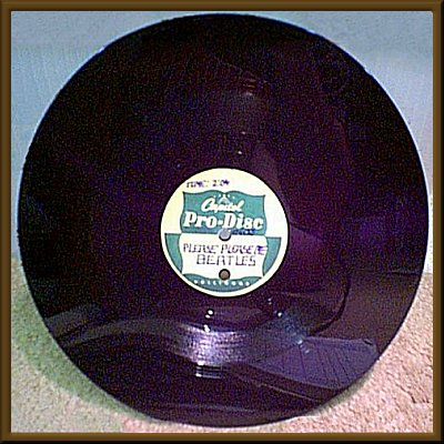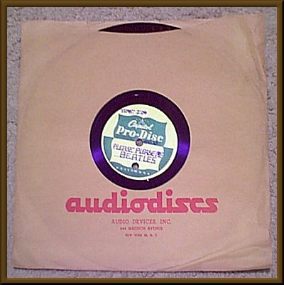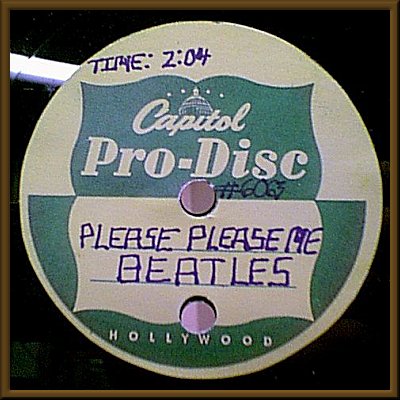 As described below, the most interesting thing about this disc is that the recording includes a count-in. Bruce Spizer describes this type of Capitol label as originally used in the 1950s. But around 1965, apparently, Capitol began to use these labels again. AUCTION DESCRIPTION: This is a very rare 10" Acetate on Capitol records of the Beatles classic hit "Please Please Me." CONDITION IS EXCELLENT. This is one of the rarest versions of any Beatles' song that I have ever heard !! The version on this acetate has a countdown intro where a male voice says, "one, two, three, four" == which was later trimmed off every version ever offered for sale. These rare four words actually create another version of this classic song. Please feel free to call me and I will play it for you over the phone. [Chazz's note: regretably I didn't do that]. Only the inner seven inches of the acetate is cut. The outer portion is blank. The "B" side is blank.There is a green and white label which reads-"Capitol Pro-Disc Hollywood". The label itself has the time,title,label number and group handwritten in dark blue. The time of the record is two minutes and four seconds. The Number of the record is 6063. The matrix number etched-in reads- 2967-REF. So obviously this is a reference disc-not necessarily meant to be released to the public. This is also the same matrix number on the Vee Jay 45 so I hypothesize that this is the master that Vee Jay had to send to Capitol Records when Vee Jay had to give up rights to the song...The actual 45 was released in 1965 on the green swirl Capitol label... This is an Audiodisc master acetate in which the sleeve reads-"New York 22, New York". So therefore,the sleeve was printed before 1964. This gives credibility to the item not being recently configured. I obtained the acetate from the estate of one of the former owners of the Electric Factory in Philadelphia. The acetate was given to him by Derek Taylor who was the Beatles' Press Secretary. It was given to him as a gift/inducement in order for him to spotlight one of Mr. Taylor's lesser known groups. RECORDING HISTORY: See the Dick James acetate for this song - here