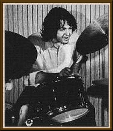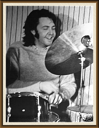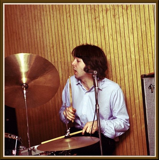 According to photographer, Tom Hanley, "This photograph was taken the night before Paul married Linda. The only reason I can be certain of the date is because shortly after finishing this little ad-lib session with other musicians in the Apple basement studio, Paul walked casully out of the building, bought a ring on the way home and the next day married Linda. Not a word to anyone and we only knew when we read it in the next day's midday editions."