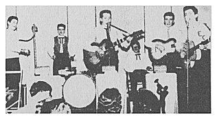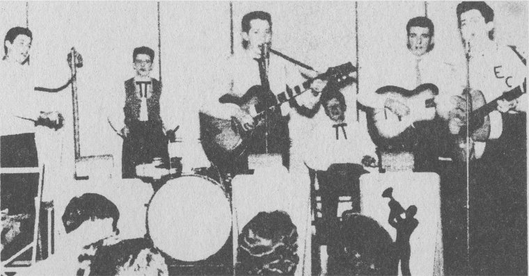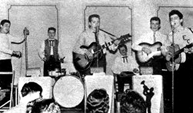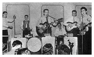 Early 1957 (probably) Wilson Hall Speke Rd. Garston, Liverpool Photographer: unknown (maybe Leslie Kearney?) These are probably the earliest "performance" photos of any of The Beatles. I'm making three assumptions here - 1. These photos pre-date the 23 May 1957 photo seen in the next section because Ringo looks a bit younger here. 2. This is Wilson Hall based on the rectanular designs on the wall. 3. That the photo to the right is the same date. At this time, I cannot verify any of these theories. See an article about this band by Bill Harry - here The personnel in this line-up is different to that seen in the next section. There appears to be an additional member and other members seem to be on different instruments. Can anyone clarify this? See the next section for a list of the five member line-up. |