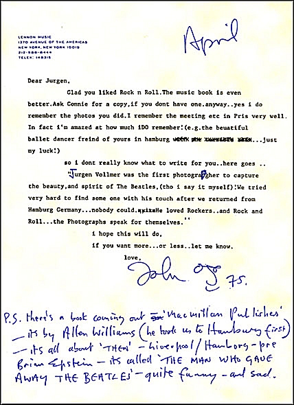A 1975(?) letter written by John to Jurgen Vollmer about his 1961 photos.