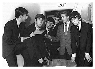 This photo is backstage prior to The Beatles' performance at this venue. It was taken during The Beatles' first radio interview conducted by Monty Lister for "Sunday Spin". The program was broadcast via closed-circuit radio to patients of local hospital Cleaver and Clatterbridge.